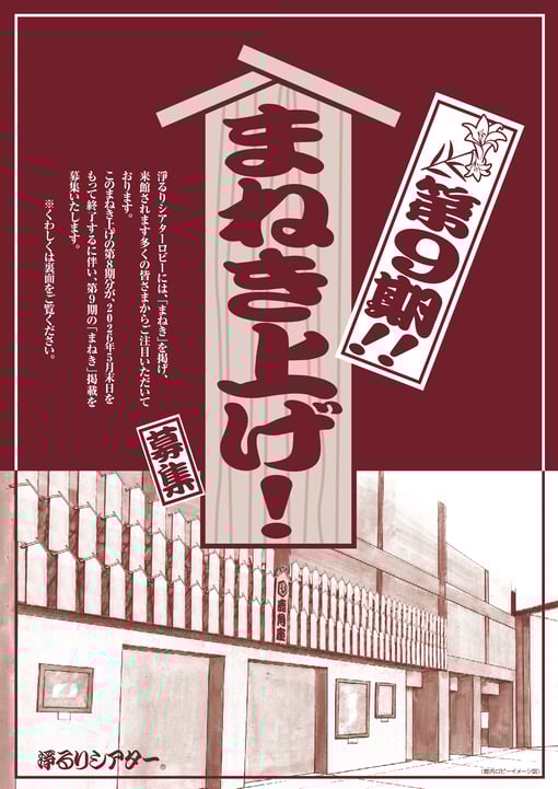 淨るりシアターロビーに掲げられている「まねき上げ」の第8期分が令和8年5月末日をもって終了するにともない、第9期の「まねき上げ」を募集します。